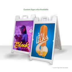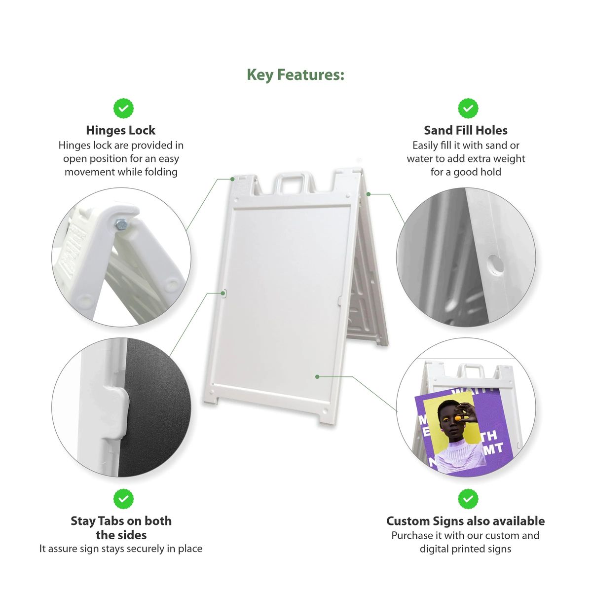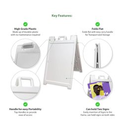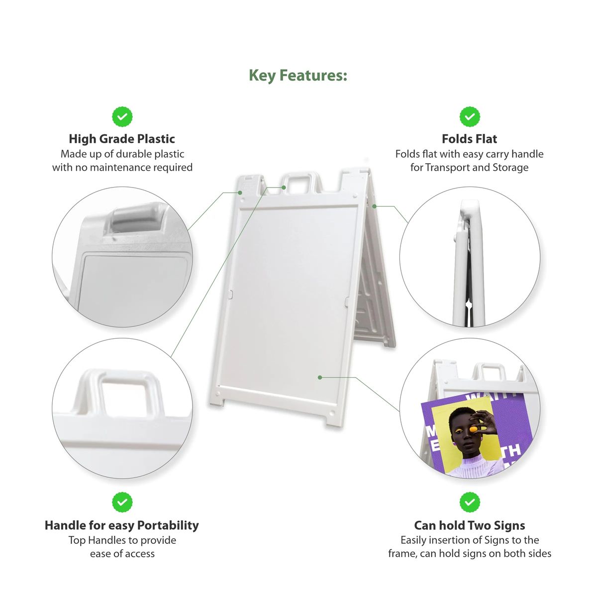 26.8" x 42.5" Premium Plastic A-Frame with Stay Tabs. Made from durable plastic and easy to fold, store, and carry with a built-in handle. Stay tabs help secure inserts in place. Features hinge locks for stability and sand-fill holes for added weight-ideal for outdoor use and promotions. Holds two signs.